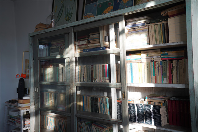 午后阳光照射到室内满是旧书的书架上