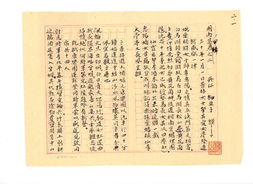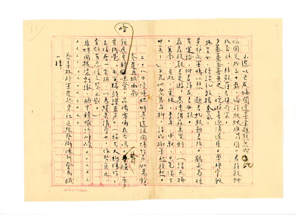 弟自去年七月初起,即患脑疾,不与任何人通信,迄今已逾一周岁矣!近日始稍痊可,适从北京饭店移居北长街八十九号… …弟有第一次到港诗稿数帙,寄存兄处,托代觅人录副,未知已妥办否?如有两份,则请以副本设法寄京,原稿仍存兄处,为名山之藏,可否?如何之处,尚希示覆,千万感激之至!