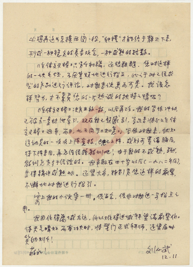 这封书信落款处没有具体的年份,但我们从内容上不难推断出时间。如信上所言,《如意》(1980年2月写毕)已经完稿并发表,而《立体交叉桥》(1980年10月写毕)是初稿未发表,结合两部作品的创作时间和发表年份来推断,这封信应该写于1980年12月11日。至于信中提到的“另一素材”应该是紧接着于1981年1月创作完成的《大眼猫》。