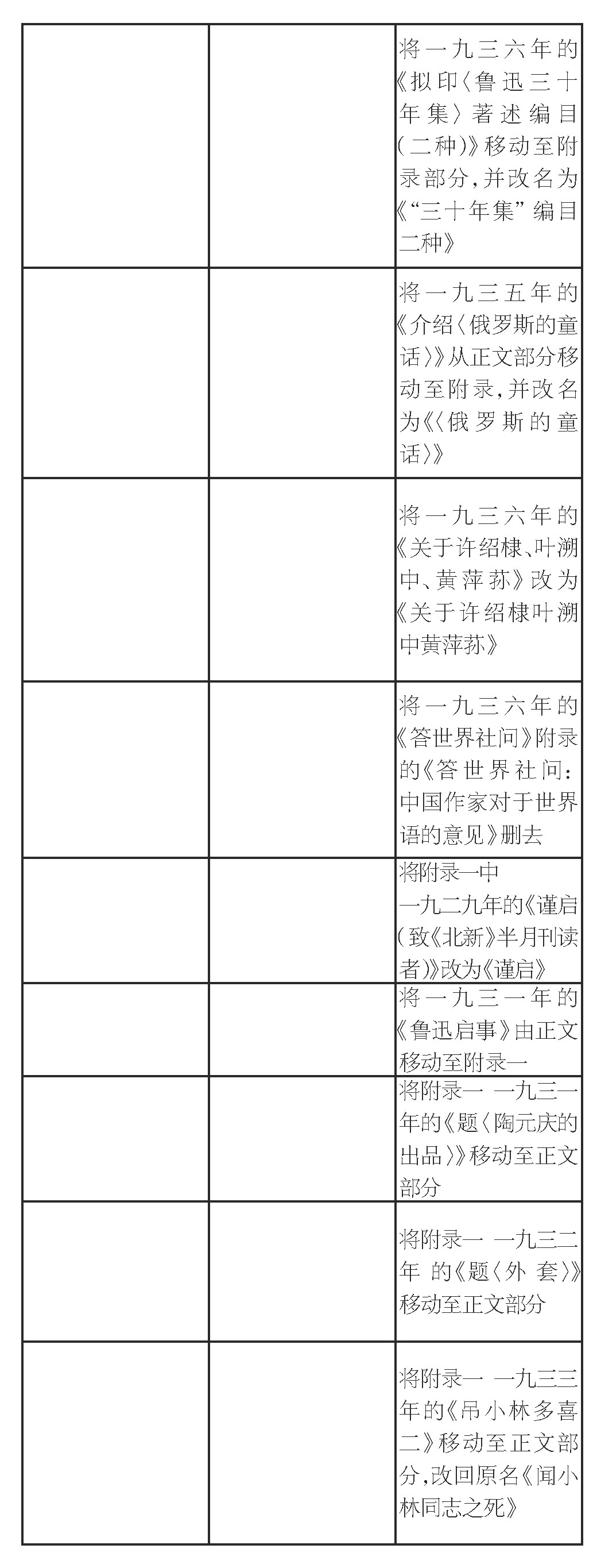 《集外集拾遗补编》篇目的变动分为三种情况——增、删、改,数量依次递增:增加篇目14篇,删除篇目23篇,更改篇目42篇。更改篇目又可细分为更改标题、调整顺序、调整篇目位置。更改标题25篇,如《南齐〈吕超墓志〉跋》改为《〈吕超墓志铭〉跋》,这是编注者代拟标题的情况。另一种则是恢复原有的标题。如将一九二七年的《关于“乐闻于斯”的通信》改为原名《补救世道文件四种》。调整顺序6篇,根据发表时间重新排列篇目顺序,如将《〈走到出版界〉的“战略”》《新的世故》从一九二六年移到一九二七年名下。