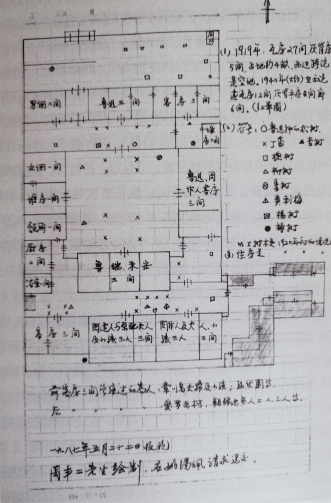 4、东厢房。南边的一间住女佣、中间的一间做堆房、北边的一间做饭所(饭厅)。上面谈到,东西厢房的北侧山墙上各辟一门,故而门的朝向必然是第三进,也就是后院。因此吃饭必须要穿过东边的门道,换句话说是进入后院。由于这个地理环境,兄弟参商以后,鲁迅不再去后院,自然只能在自己的房子里吃饭了。鲁迅在1923年7月14日的日记中这样写道:“是夜始改在自室吃饭,自具一肴,此可记也。”(20)