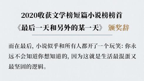 《最后一天和另外的某一天》获得了2020年收获文学榜短篇小说榜榜首,书写的是一个女杀人犯的故事。一个女人在监狱里待了整整十七年,成为了监狱里的头号模范犯人。这个女人身上到底发生了什么样的故事?对这个问题的探寻一直贯穿于我们的阅读体验中。收获文学榜颁奖辞对小说的理解是这样的:“小说试图窥探这个女人谜一样的人生,却发现终究所得有限。在不得已的情况下,小说设置了戏中戏,一部以此女人为原型的戏剧在舞台上演,作为原型的女人坐在观众席里冷若冰霜。这是作家和他作品中人物的角力,在这个意义上,艾伟的这篇小说带有“元小说”的气质,因此小说有两个文本面向,在表层文本里,女犯人的故事以悬疑剧的方式勾起了读者足够多的好奇心;在深层文本里,这是一个关于作家无法驯服其作品人物的故事,它暗示了艺术的高度和限度。而在最后,小说似乎和所有人都开了一个玩笑:你永远不会知道你想知道的,因为这就是生活最混蛋又最坚固的逻辑。”《最后一天和另外的某一天》写了不可理解之理解,因而深不可测。