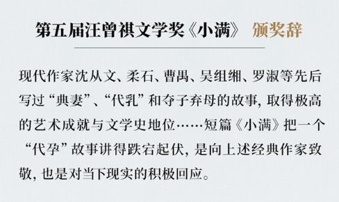《小满》讲了女性母爱本能和身体的关系,获得第五届汪曾祺文学奖。小说讲述的是一个关于代孕的故事,塑造了女主人公小满、古董商人白先生、白太太、女佣喜妹这几个人物形象。白先生外表斯文,内心却藏着不可告人的秘密;白太太表面平易近人,但也有毫不留情的时刻;佣人喜妹对主人家忠心耿耿,却更显“奴性”,而作为代孕母体的主人公小满在这场伦理悲剧中,由天真善良变得疯疯癫癫。艾伟将故事讲得跌宕起伏,让人物自由生长于文字之间,也回应了当代的社会现实问题。汪曾祺文学奖给《小满》的颁奖辞强调了小说的现实意义:“你若非喜妹,将如何看待类似的代孕故事?作者的追问难以回避,小说的撼人力量正由此而来。”