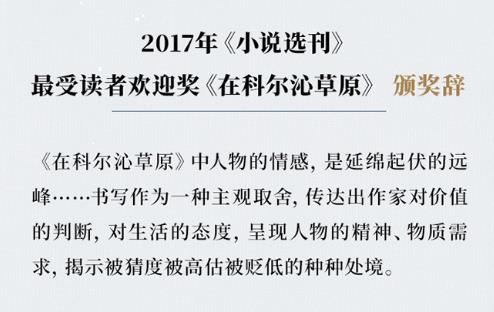 《在科尔沁草原》讲述男女之间不可言说的复杂和暧昧,获2017年《小说选刊》最受读者欢迎奖。颁奖辞中写道,“《在科尔沁草原》中人物的情感,是延绵起伏的远峰。故事情节作为“冰山的水上部分”,由富有意味的一系列变化构成。这些外在的变化带来转折的诧异,也体现人物的内在诉求。书写作为一种主观取舍,传达出作家对价值的判断,对生活的态度,呈现人物的精神、物质需求,揭示被猜度被高估被贬低的种种处境。”