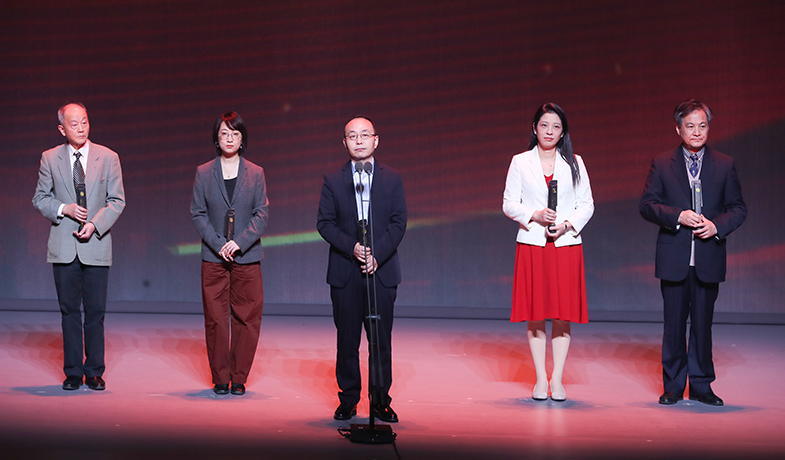 龚盛辉、欧阳黔森、蒋巍、丁晓平、钟法权(从左至右)领取报告文学奖