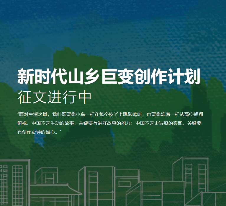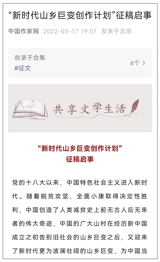 2022年3月17日,中国作家协会正式发布“新时代山乡巨变创作计划”征稿启事。征稿启事中写到,“新时代山乡巨变创作计划”以原创长篇小说形式聚焦新时代中国山乡天翻地覆的史诗性变革,多角度展现乡村时代变迁,生动讲述感天动地的山乡故事,塑造有血有肉的人民典型,为人民捧出带着晶莹露珠、散发泥土芳香的新时代文学精品,以文学力量激发新时代乡村振兴的昂扬斗志与坚定信念。