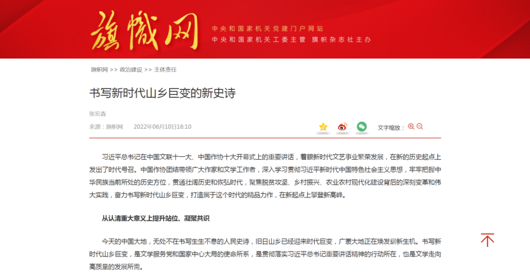 《旗帜》杂志2022年第5期发表中国作家协会党组书记、副主席张宏森文章《书写新时代山乡巨变的新史诗》。张宏森说,习近平总书记在中国文联十一大、中国作协十大开幕式上的重要讲话,着眼新时代文艺事业繁荣发展,在新的历史起点上发出了时代号召。中国作协团结带领广大作家和文学工作者,深入学习贯彻习近平新时代中国特色社会主义思想,牢牢把握中华民族当前所处的历史方位,贯通壮阔历史和恢弘时代,聚焦脱贫攻坚、乡村振兴、农业农村现代化建设背后的深刻变革和伟大实践,奋力书写新时代山乡巨变,打造属于这个时代的精品力作,在新起点上攀登新高峰。