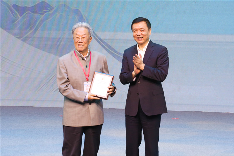 张宏森代表中国作协向王蒙颁发镌刻着15946天入会日期的专属纪念牌