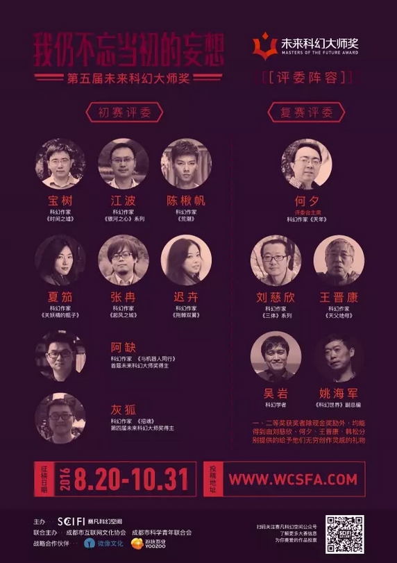 经过4年的发展,“未来科幻大师奖”累积投稿量近千篇,同时涌现出阿缺、灰狐、胡绍晏、念语等一批活跃在科幻文学创作一线的科幻作家,其中历届征文比赛中的部分获奖作品也正在影视转化的制作过程中。2016赛凡科幻空间携手成都市互联网文化协会、成都市科学青年联合会正式启动第五届“未来科幻大师奖”,我们热诚期待您的参与。