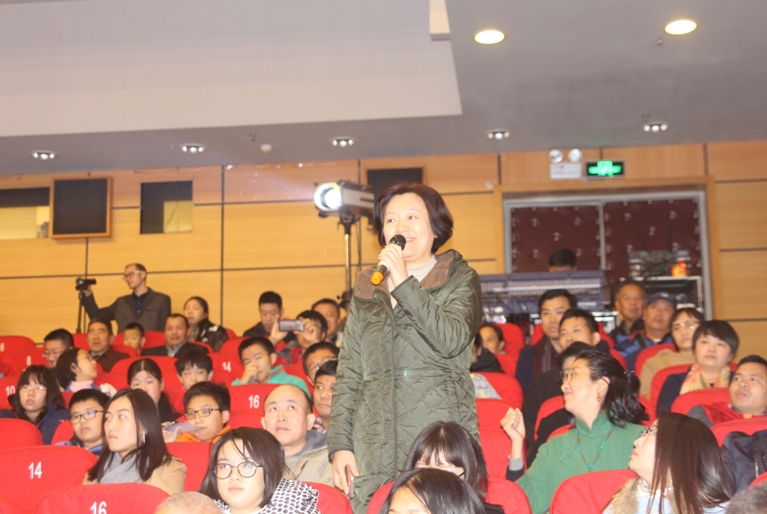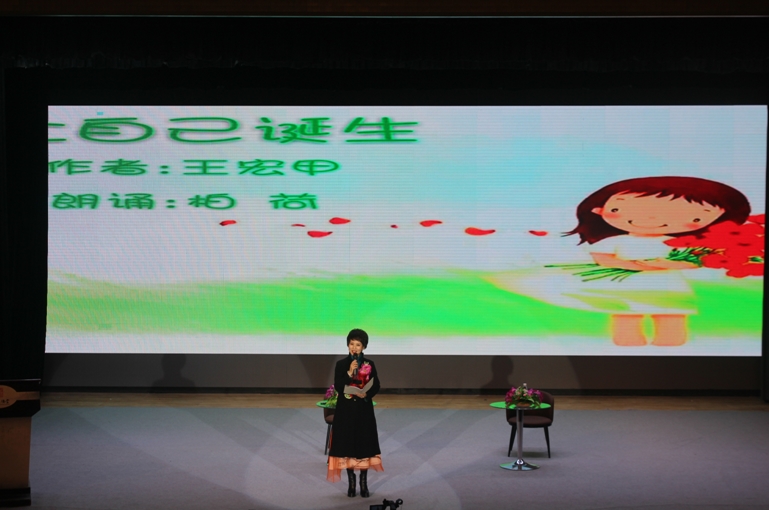 讲座现场,柏荷朗诵王宏甲《让自己诞生》序言节选