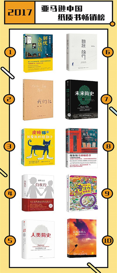 2017年亚马逊中国最畅销的纸质图书前三为《解忧杂货店》《我们仨》和《皮特猫》,最畅销的Kindle付费电子书前三是《三体全集》《解忧杂货店》和《福尔摩斯探案全集》,乌鲁木齐、贵阳、兰州位居“挚爱阅读城市榜”前三。2017年重点书籍纸电同步发行的比率比去年增长近60%,二者相互促进效应明显。