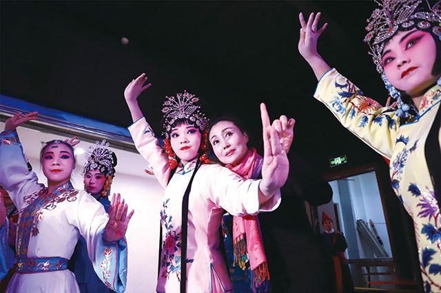 图为国家级非物质文化遗产项目评剧代表性传承人袁淑梅(右二)在后台指导演员