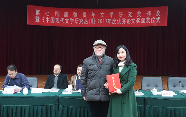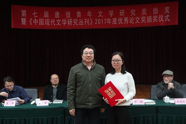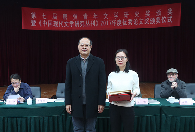 丁帆为《中国现代文学研究丛刊》2017年度优秀论文奖获奖者颁奖,李娜代赵稀方领奖