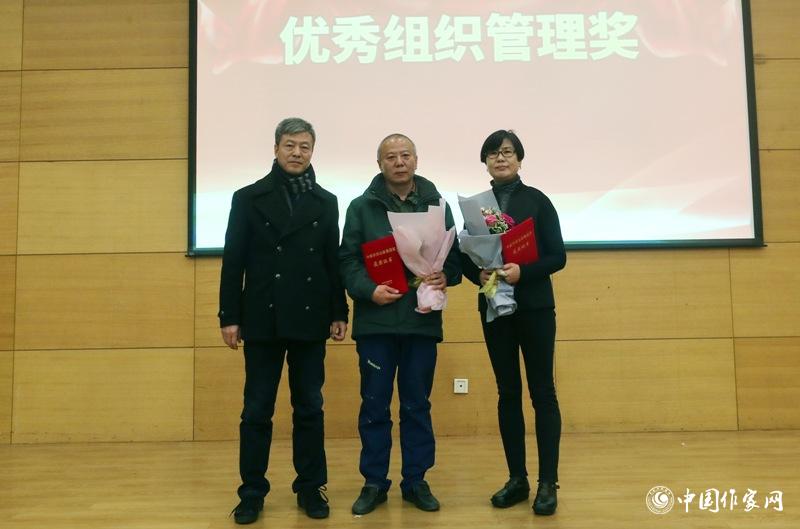 梁鸿鹰为优秀组织管理奖获得者周正、张晓瑄颁奖