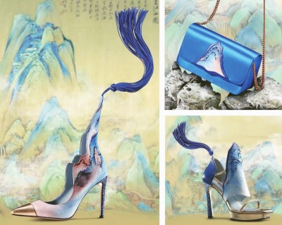 《千里江山》系列缂丝高订箱包、女鞋。PACC携手第六代缂丝传承人王建江与中国原创文化设计鞋履品牌sheme设计师李丹、海派设计师苗海燕共同创作。