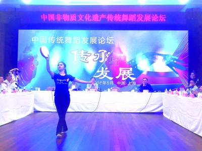 中国非物质文化遗产传统舞蹈发展论坛现场,演员展示舞蹈动作。张 婷 摄