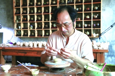 刘坤庭在工作室内制作陶瓷 王骁金龙 摄