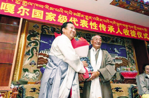 西藏自治区藏剧团团长班典旺久(左),拜国家级非物质文化遗产项目嘎尔代表性传承人平措玉杰(右)为师,并向老师敬献哈达和鲜花。 何蓬磊摄