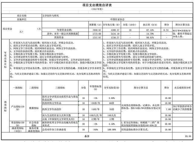 根据年初设定的绩效目标,“文学创作与研究”项目自评得分为93.84分。产出效益:组织了多批作家深入生活、儿童文学奖评奖、文学作品扶持、发展了少数民族文学创作,进行文学评论的创新与研究。发现的主要问题及原因:一是年初设置的个别指标不合理;二是部分二级项目执行进度较慢。下一步改进措施:增强指标设置的科学性,加快预算执行进度,提升文学工作的开拓性与创新性。