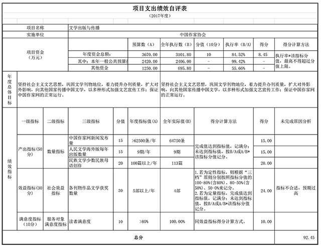 我会2017年在中央部门决算中反映“文学创作与研究”和“文学出版与传播”两项目绩效评价结果。