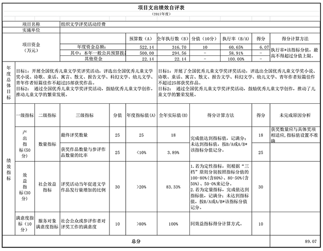 经我单位自评,“组织文学评奖”项目绩效得分为89.07分。