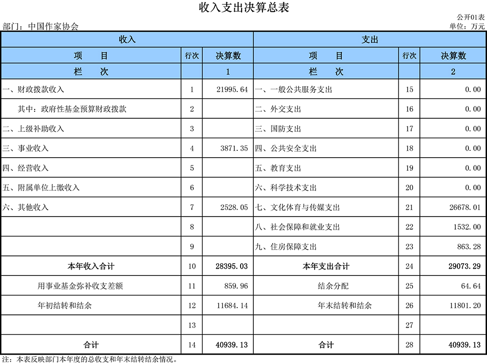 中国作协2017年度收入总计40939.13万元,支出总计40939.13万元。与2016年相比,收、支总计各增加3983.56万元,同比增长10.78%。
