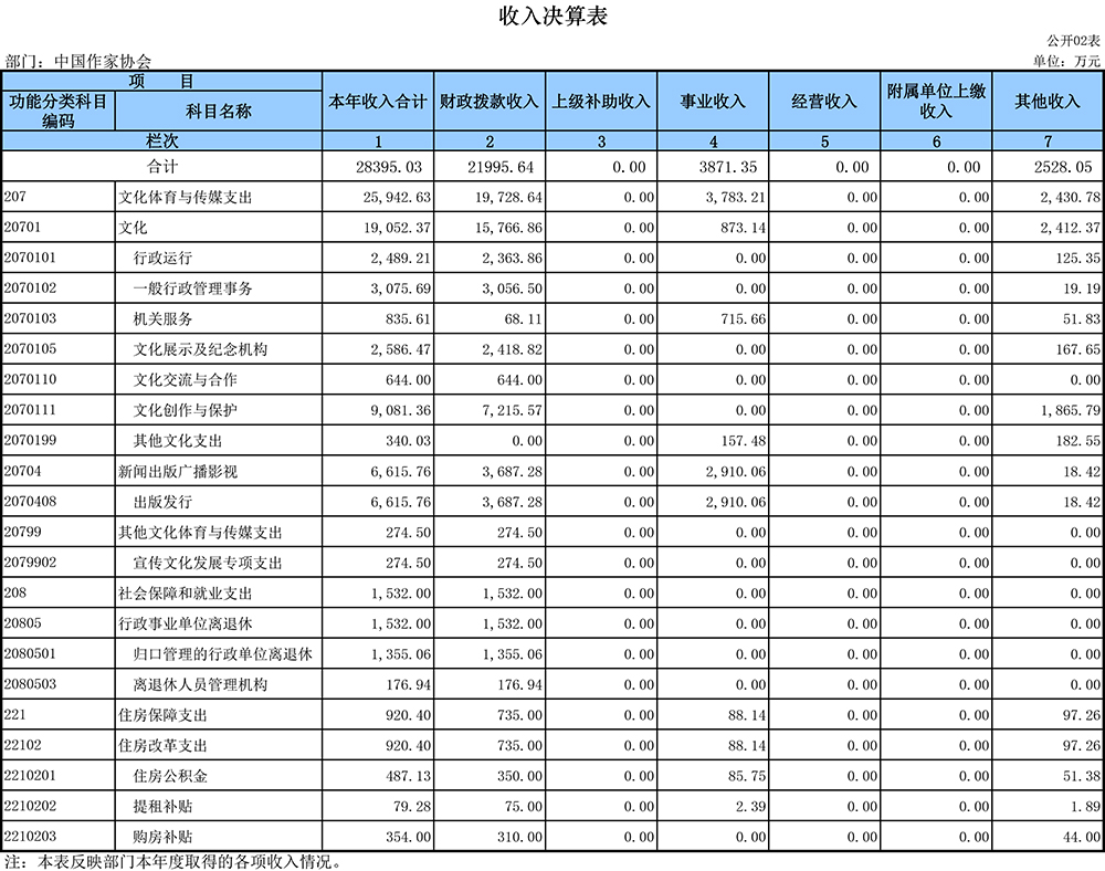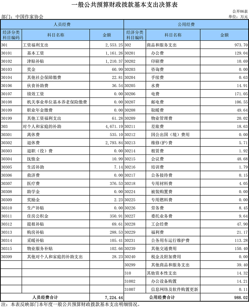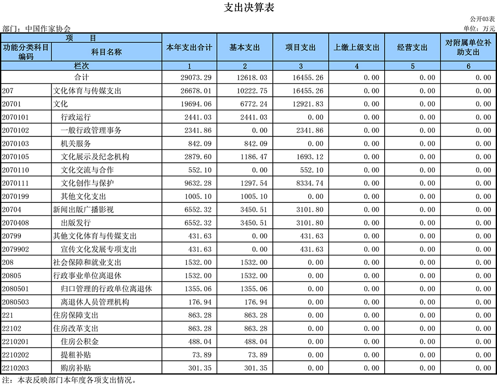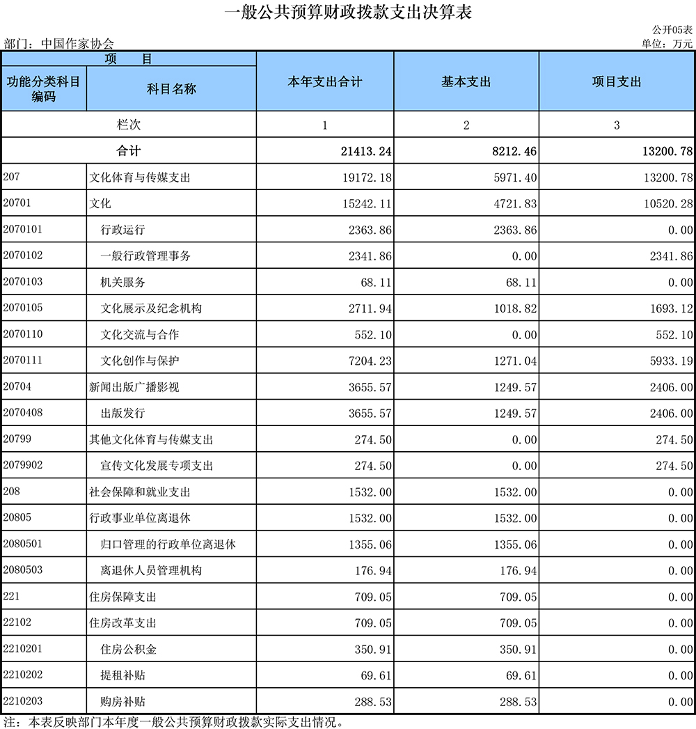 七、文化体育与传媒(类)文化(款)行政运行(项):指中国作协本级行政人员工资及机构正常运转、履行职责所需的基本支出。