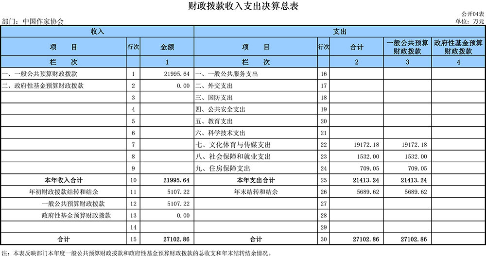 中国作协2017年度财政拨款收支总决算27102.86万元。与2016年相比,财政拨款收、支总计各增加2765.16万元,增幅11.36%。