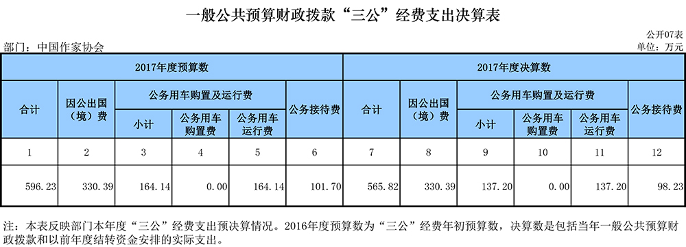 中国作协2017年财政拨款“三公”经费支出预算为596.23万元,其中:因公出国(境)费330.39万元,公务用车运行费164.14万元,公务接待费101.70万元。