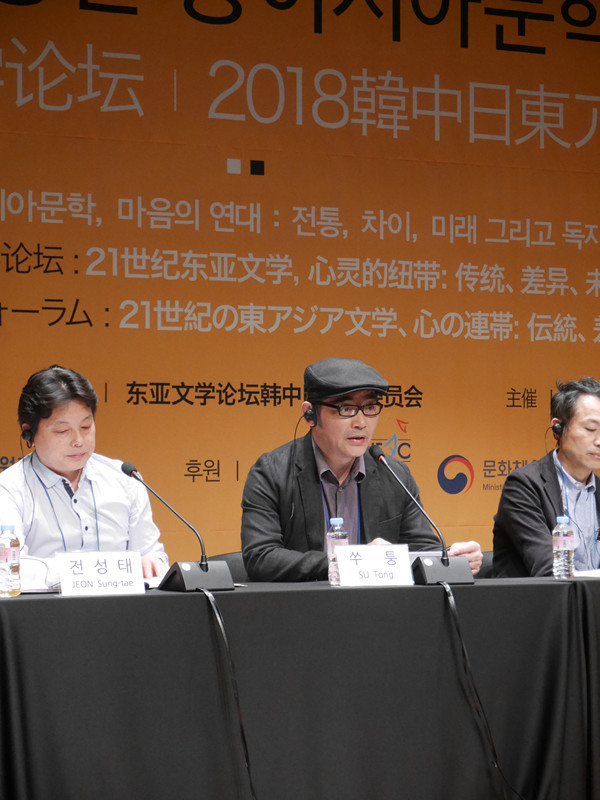 17日下午,中国作家苏童,韩国作家全成太、金爱烂,日本作家阿部公彦、若松英辅围绕“传统”这一话题发表了各自的看法;中国作家张炜、曹有云,韩国作家陈恩英、张康明以及日本作家岛田雅彦、小山田浩子等就则“差异”展开交流。