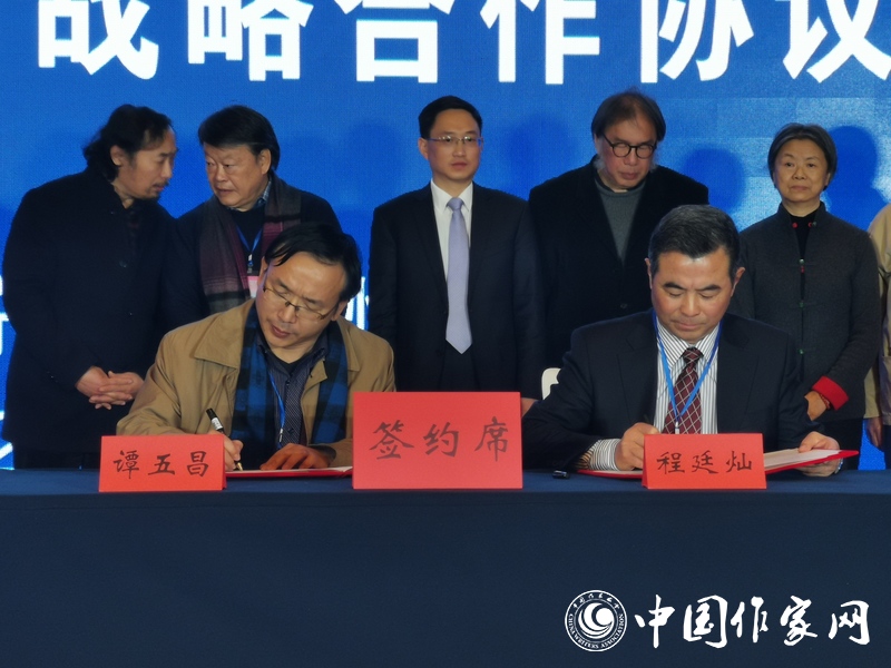 谭五昌代表海子诗歌奖评委会,程廷灿代表怀宁县人民政府,签署了海子诗歌奖永久落户安徽怀宁战略合作协议的签约仪式。