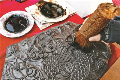 “这个环节看似简单,但必须把墨均匀的涂开,否则线条不流畅。”来自天津一家画庄的男主人吴学军、女主人李月凤,夫妻二人自幼酷爱绘画,师承著名国画家韩祖音先生,他们现场指导游客将雕刻好图案的木板套印在白纸上,生动的“胖娃娃抱鲤鱼”跃然纸上。