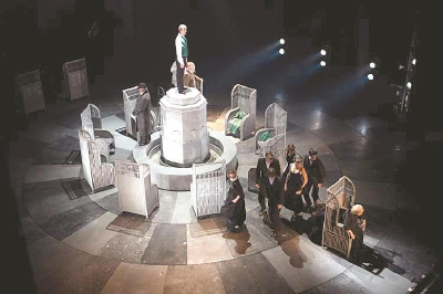 福金:小说《赌徒》吸引我的地方在于,主角面对人生的选择,就像面对赌场里的轮盘赌。我把舞台设计成一个转动的赌盘,舞台不停转动,指针随机地指向零或其他数字,这象征着男主角阿列克谢的处境——他绝望地爱着将军的养女波琳娜,却没有勇气追求爱情;他被困在那座以温泉和赌场出名的度假小城,无法选择自己未来的道路,他的人生成为一场“押对”和“押错”之间的游戏。每一个出现在舞台上的角色都会被赌盘推着走,轮盘赌的游戏吞噬了每一个人——阿列克谢、将军、老太太……他们的生活陷入了各种各样的障碍,有经济的,也有感情的,这群人无法面对现实的障碍,用赌徒的心态迎接未知的命运。