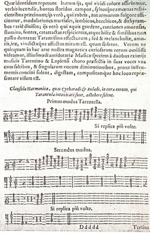 舞蹈和音乐是治疗由塔兰托毒蛛叮咬所致的疯狂病的唯一有效药物,但也不是任何的音乐和舞蹈都有效,只有在阿普利亚演奏了数百年的这种传统音乐曲调才有效,要是没有这舞蹈和音乐,病人会在几小时或者几天内死去。就这样,他们常常太阳一升起就开始跳,持续不断地跳到午前十一时。但也有些人会在中途停下,这并非是因为跳得过于疲惫不堪才不得不休息,而是因为发现舞蹈的节拍跟不上曲调。如此这般,大约跳到正午,他们才停息下来,躺到床上去尽情出汗,然后擦干身上的汗,喝点儿肉汤补充营养。大约下午一点,最迟两点,舞乐又开始了,人们一直跳到晚上。这样一连数日,病人精疲力竭了,病也就暂时治好了。据说有一些人,大部分是陷入爱情之中或者感到孤独寂寞的人,为了加入跳舞的行列,甚至假装发病。这些人大多是恋爱中的女子和单身汉,希望在这舞蹈意淫中获得性的满足。