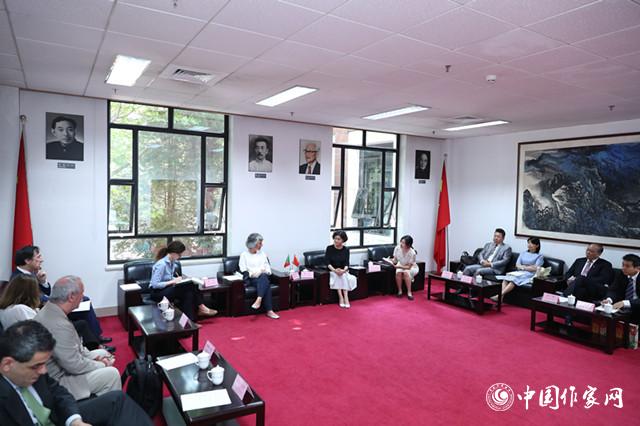 论坛开幕前,中国作家协会主席铁凝与葡萄牙文化部长丰塞卡亲切会谈,中葡两国作家代表参加会谈