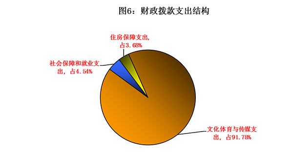 2018年度财政拨款支出20202.98万元,主要用于以下方面:文化体育与传媒(类)支出18542.08万元,占91.78%;社会保障和就业(类)支出917.64万元,占4.54%;住房保障(类)支出743.26万元,占3.68%。