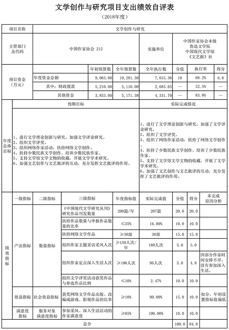 1.“文学创作与研究项目”绩效自评综述:根据年初设定的绩效目标,项目自评得分为84.8分。项目全年预算数10,281.38万元,执行数为7,015.36万元,完成预算的68.2%。项目绩效目标完成情况:组织多批作家深入生活,举办鲁迅文学奖评奖,开展各类文学作品扶持;专款扶持了少数民族文学和网络文学创作;丰富了中国现代文学馆的收藏和扩大了现当代文学创作展览内容;开展了文学学术研究,加强了文艺创作与文艺批评互动,充分发挥了文艺批评的作用;进行了文学理论创新与研究,加强了文学评论研究。发现的主要问题及原因:一是年初设置的个别指标不够科学;二是部分二级项目执行进度较慢。下一步改进措施:增强指标设置的科学性,加快预算执行进度,改进工作,突出中国作协的政治性、先进性和群众性。