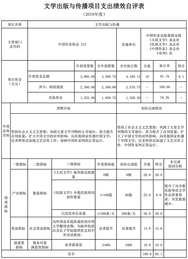 2.“文学出版与传播项目”绩效自评综述:根据年初设定的绩效目标,项目自评得分为82.1分。项目全年预算数4,509.75万元,执行数为4,109.13万元,完成预算的91.1%。项目绩效目标完成情况:坚持了社会主义文艺思想;巩固了主要文学刊物的主导地位,着力提升了办刊质量;扩大了中国文学的对外影响,向其他国家传播了中国文学;以多种形式加强了文艺宣传工作;云顶4008集团官网正常运行。发现的主要问题及原因:一是部分绩效指标设置不科学,不利于绩效评价和实际工作的开展,执行过程中完成难度较大;二是文学刊物的发行需要进一步提高。下一步改进措施:根据项目目标要求和实际工作开展情况,合理设置绩效指标,着力突出文学刊物的受众面和影响力。