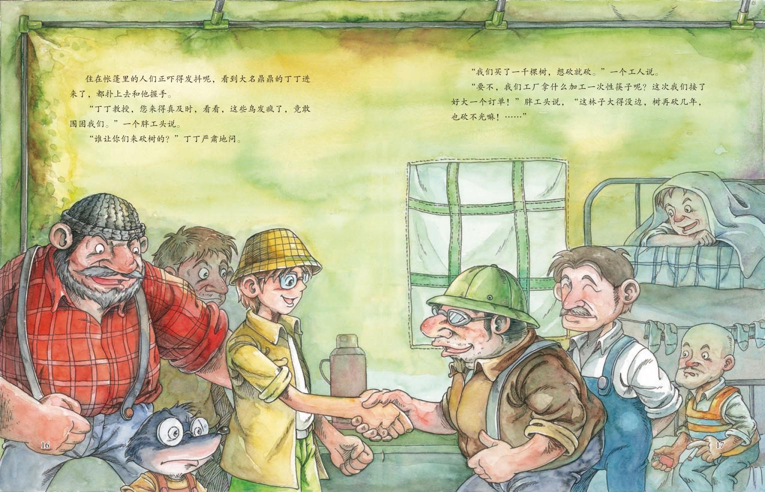 森林闯进来要砍大批树的伐木工,鸟儿们为了顺利筑巢孵宝宝而包围了伐木工的帐篷。神奇绿色营赶来了,丁丁与伐木工的谈判中,帮他们找到了更好的一次性餐具的植物粉替代品。伐木工们撤退了,森林保住了。