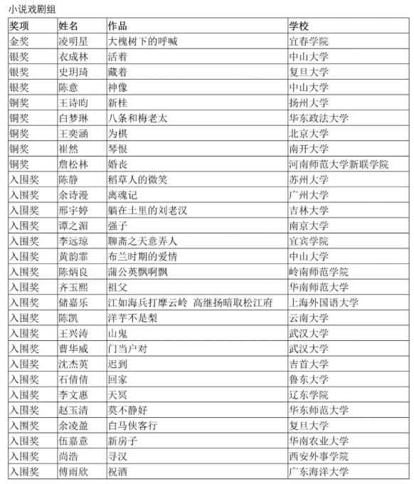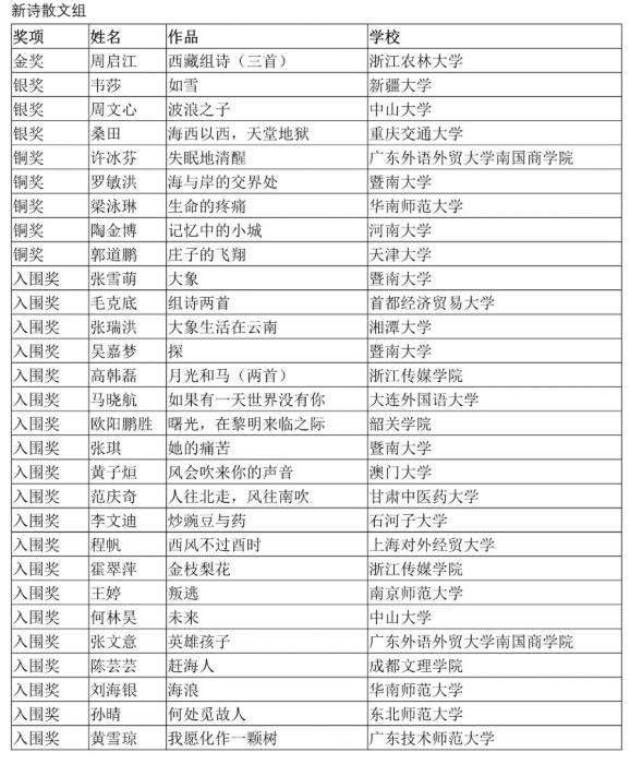 此次大赛2020年5月23日发布征稿启事以来,共收到来自全国各地471所高校共计2053份作品,其中小说戏剧组稿件953篇,新诗散文组稿件1100篇。大赛组委会组织高校教授、作家、文艺评论家、资深编辑进行初审、复审、终审三个环节,三轮评审全程匿名,评审专家客观对待每一个作品,保证结果公正。每组评选出金奖1名,银奖3名,铜奖5名,入围奖20名,共评出58件优秀作品。