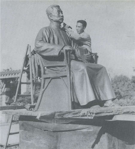 鲁迅塑像翻制成铜像。图为原作者萧传玖教授在修琢铜像。