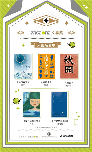 今年,一个致力于挖掘优秀原创作品,鼓励年轻创作者和文学新人的全新文学奖——PAGEONE文学奖由PAGEONE书店、清华大学文学创作与研究中心与国际出版品牌Astra House共同发起。3月17日,首届PAGEONE文学奖公布入围短名单,榜上有名的作品有:梁空的《地下春天》、张忌的《南货店》、杨本芬的《秋园》、孙频的《我们骑鲸而去》以及陈春成的《夜晚的潜水艇》。