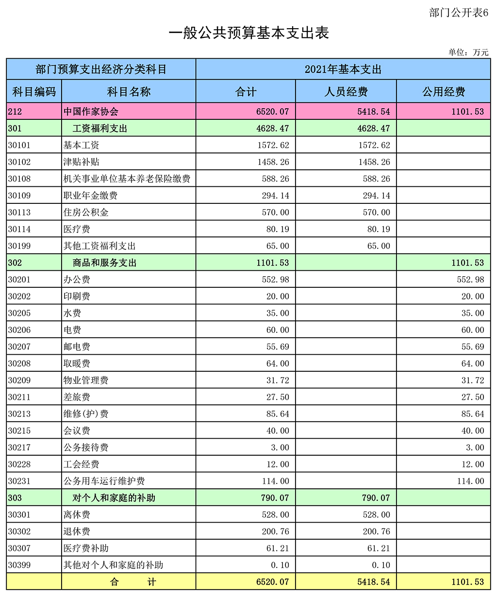 中国作家协会2021年一般公共预算基本支出6520.07万元,其中: