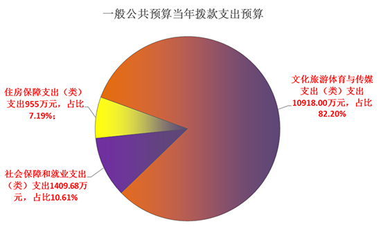 文化旅游体育与传媒支出(类)支出10918.00万元,占比82.20%;社会保障和就业支出(类)支出1409.68万元,占比10.61%;住房保障支出(类)支出955.00万元,占比7.19%。