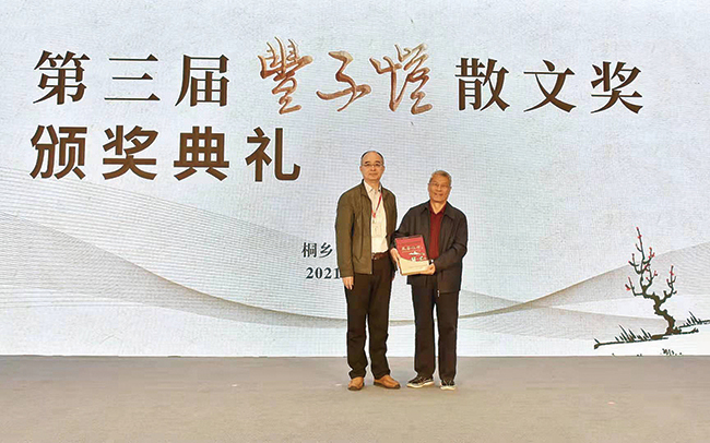 中国作协党组成员、书记处书记吴义勤向第三届丰子恺散文奖特别奖获得者梁衡颁奖。