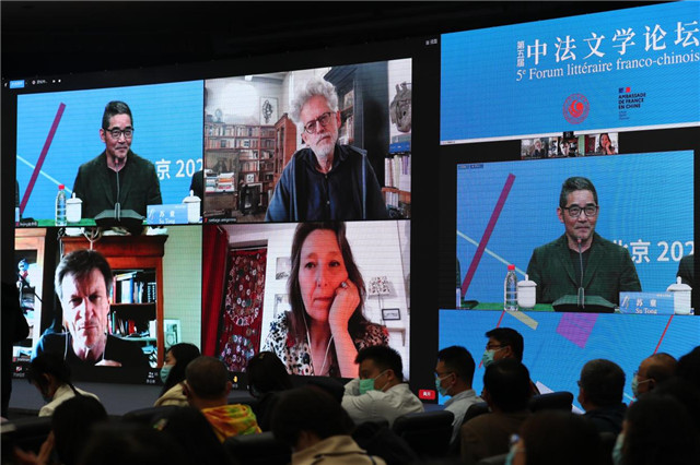 在一年一度的世界读书日即将到来之际,4月21日,由中国作家协会和法国驻华使馆共同主办的第五届中法文学论坛以线上和线下相结合的方式在北京中国现代文学馆举行。中国作家协会主席铁凝,法国驻华大使罗梁出席论坛并致辞。中国作家苏童、梁鸿、徐则臣在现代文学馆现场与法国作家马库斯•马尔特、玛丽•达里厄塞克、圣地亚戈•阿米戈雷纳视频连线,围绕“文学的所见与未见”这一主题,从不同角度探讨了文学所见证的,以及文学有待探索的。论坛开幕式由中国作家协会党组成员、书记处书记胡邦胜主持,北京大学法语系主任董强主持了作家对话环节。鲁迅文学院第39届高研班学员以及各界文学爱好者百余人参加论坛。