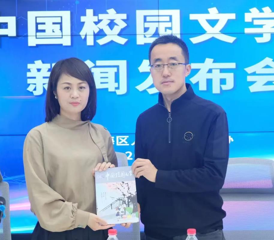 《中国校园文学》主编徐峙(右)向瓯海区委宣传部副部长、区文联主席周卢琴赠送《中国校园文学》