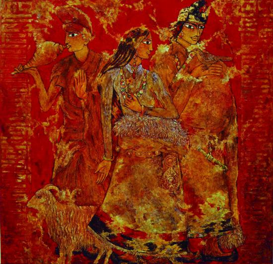 于是从上世纪80年代末至90年代初,我“三进”西藏体验生活。期间对中国壁画、中国画、民间绘画、中西方文化的差异等各方面都做了很多梳理学习工作。在西藏写生的过程中及回来之后的美术创作中,我一直没有停止过思考,同时也更加深刻地感受到,艺术创作要想真正找到一条适合自己的表现方法和道路是非常困难的,这个过程中要做各种尝试,更多的时候是失败。寻找的过程是曲折的,只有在不断的失败与尝试中才可能慢慢形成适合自己的表现手法,然后再慢慢走向成熟。在此过程中我也认识到,中国的美术创作要走出一条自己的道路,美术家就要在民族性、时代性和个性这三性的体现与结合中去寻找。体现民族性需要研究历史,体现时代性就要把握时代特色以及掌握当下技术技巧的创新。同时,老一辈美术家的创作实践也给了我很大启发。如徐悲鸿《愚公移山》中对民间神话元素的表现;董希文在西藏用“中国线条”创作的很多人物写生与风景画;又如赵无极、朱德群等艺术家对中国宋代绘画的解构,对东方意境的表现;再如吴冠中作品中大量的留白与点线面的极致提炼,对勾线填色技法的运用等。他们的创作对西方油画艺术进行创新改造,把更多的中国元素融入作品中形成自己独特的风格,使自己的绘画跟世界各国的画家拉开了一定距离。在这些前辈画家的启发和个人努力下,画出了1989年获奖的《天长地久》等一系列作品,并随着对中国传统文化的深度探索与学习,使通过中国文化的内涵来表现中国人精神的意识贯彻得更加彻底了。