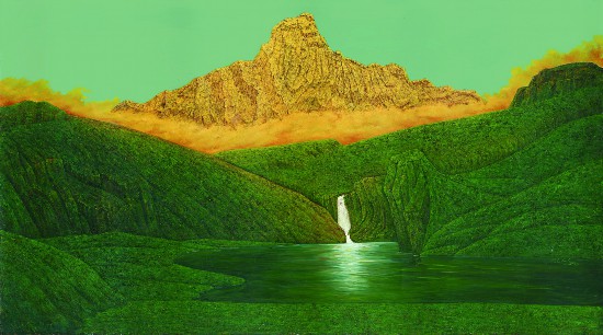 近年来,在我为大兴机场创作的油画《新辉煌》中,这种创作观念就体现得更加典型。这幅作品中,我用一个具象的表现高原雪山在阳光下呈现金色光芒的那种神圣的、瞬间的人间仙境似的画面,把习近平总书记的“绿水青山就是金山银山”的思想表现出来了。“金山银山”对应着大自然最美的景观,绿色又代表着一种蓬勃向上的生命力。这样一幅画的创作灵感来自当年我在西藏的亲身体验,也来自一个画家多年来对艺术创作的深度思考。