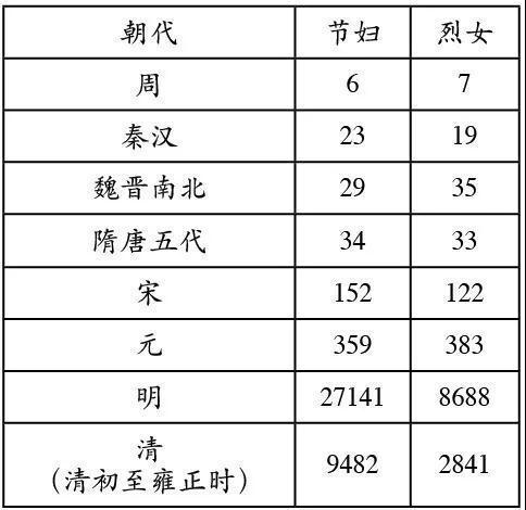 节妇本来是封建时代给予已婚妇女最高荣耀的奖赏,认为妇女对丈夫“之死靡它”才最符合儒家宣扬的礼教精神。话虽如此,其实在宋元以前,妇女出现婚外恋或寡妇再嫁的行为既不少见,人们对此也并不苛责。但不作追究并不等于推崇,所以历代对符合儒家道德标准的妇女纷纷给予旌表,而旌表人数的多少又适足以说明不同时代的封建统治者对封建礼教推行的程度。中山大学历史系董家遵教授曾根据《古今图书集成》中所录历代节妇烈女的人数做过统计,我们从中可以窥见在中国古代社会中封建礼教推行的轨迹(下表转引自顾鉴塘、顾鸣塘编著《中国历代婚姻与家庭》,商务印书馆1996年,第140页):